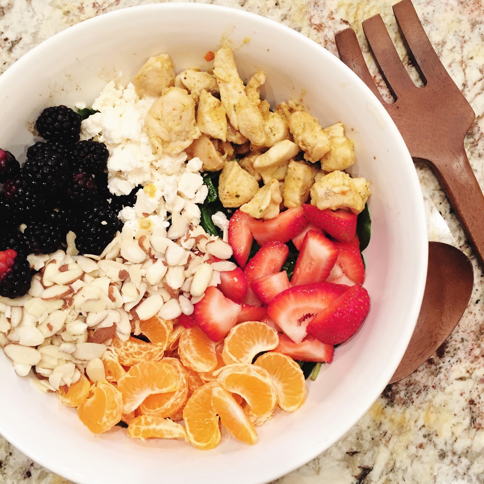Wednesday night, we decided to whip up something easy, fresh, and full of fruit and we got to work making an Almond, Berry, and Chicken Spinach Salad via Chelsea’s Messy Apron [P.S. we did modify a bit because we had blackberries instead of blueberries, but everything else was used as the original recipe]