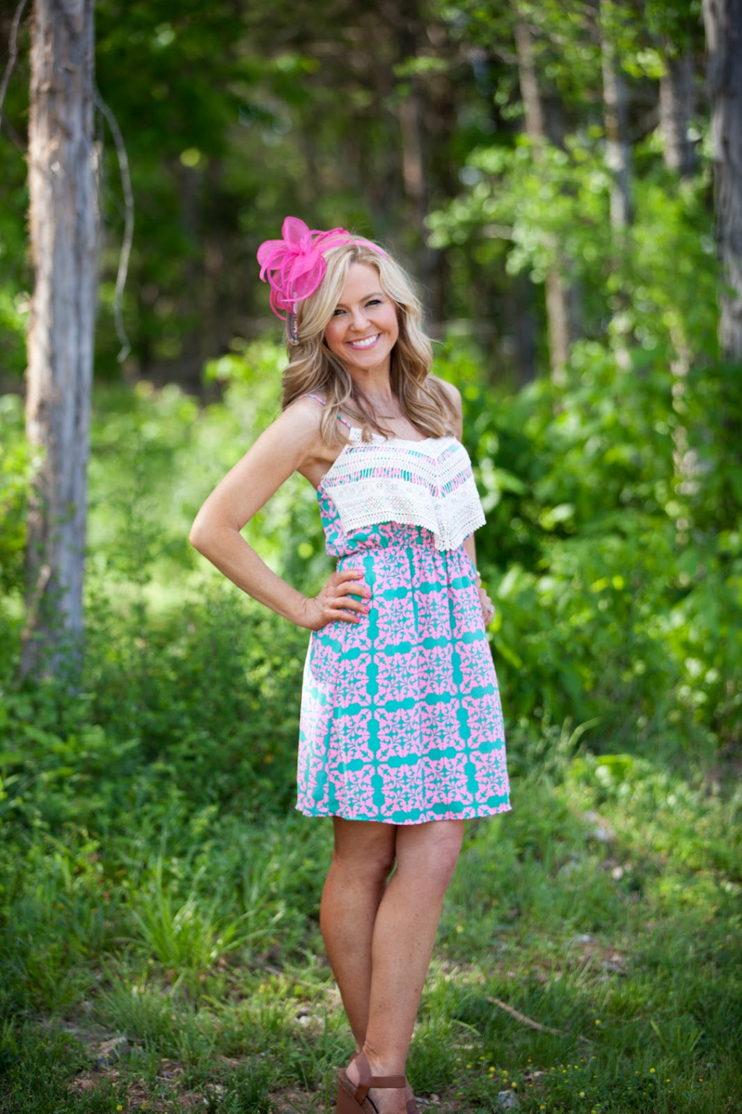 Second in line is this printed green and pink crochet dress… the color says spring and it’s a casual look perfect for taking in all the Steeplechase fun while still being comfortably cool and feeling like yourself! And of course, I had to top this look off with a bright pink fascinator full of flair… we only get a few chances to get to play derby dress-up so this pairs perfectly!
