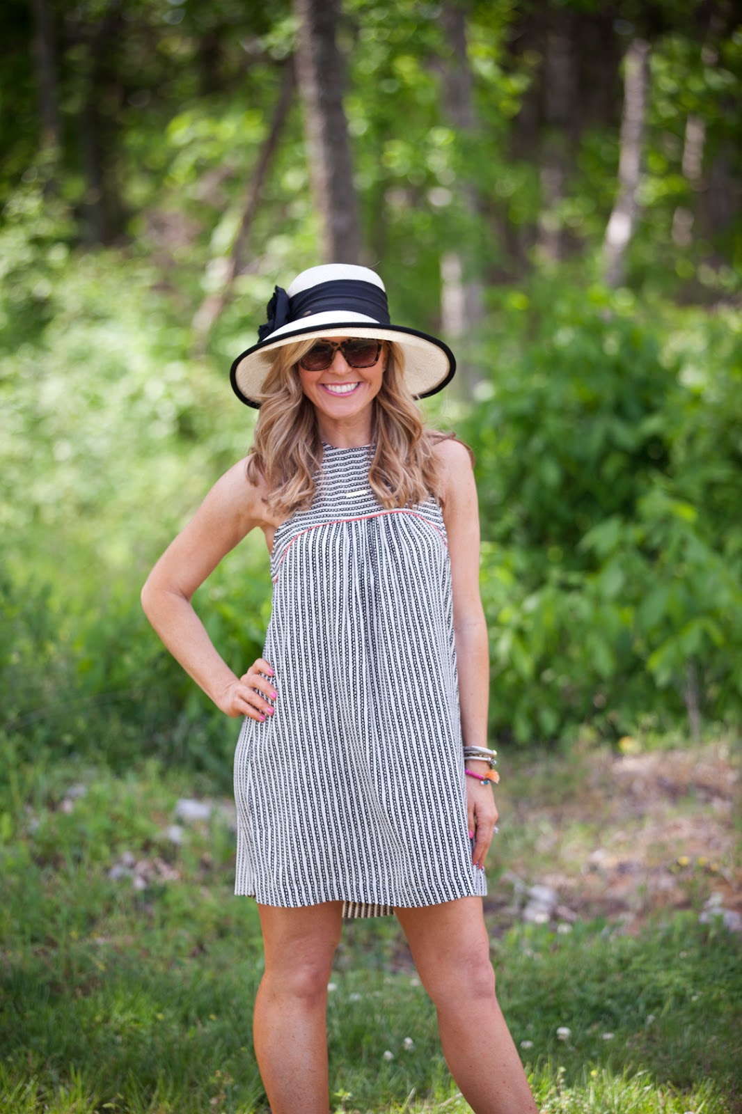 First up, this adorable black and white printed shift dress with coral piping detail. This will keep you cool during the daylong festivities and the coordinating woven hat is an accessory that will ensure you look the part, while still not spending a fortune.