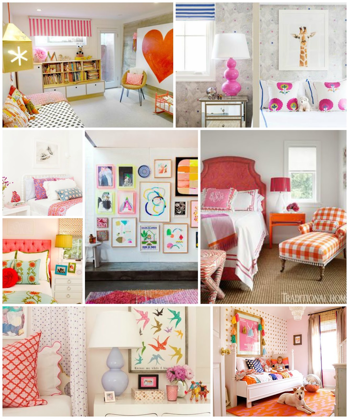 Basically, I am looking to make her room a big pop of color. We are keeping the existing paint color [Sherwin Williams First Star] which we have through the front half of our home and love, so I want to take things up a notch and go big with bold, bright colors that totally speak to her personality. Pinks, yellow, and oranges will make it stand out and will give my little Tink a space that’s perfectly suited for all things bright and happy. Here’s a few images below that showcase the aesthetic we are looking to achieve: