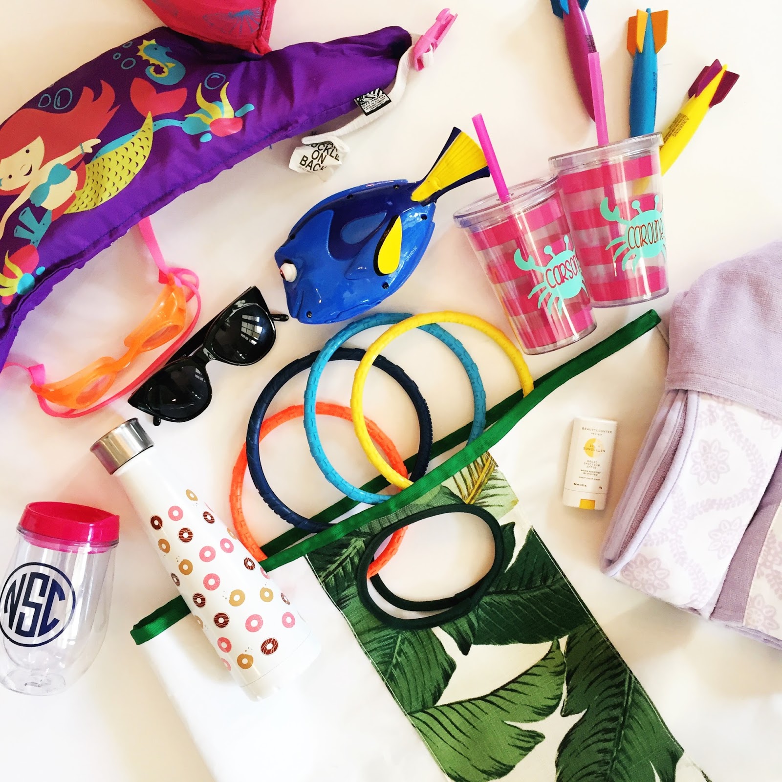 Pool days are in full rotation around our house these days… I’m pretty sure we won our own version of the lottery when we bought our house because it’s directly across from the neighborhood clubhouse and pool… jackpot for our water-loving babies!! I thought it would be fun to do a little show and tell as to the content of our bag when we head to the pool… necessities, items that make the pool visit much more fun, and some things we’ve acquired that have become so helpful when we load up and make the long walk across the street!