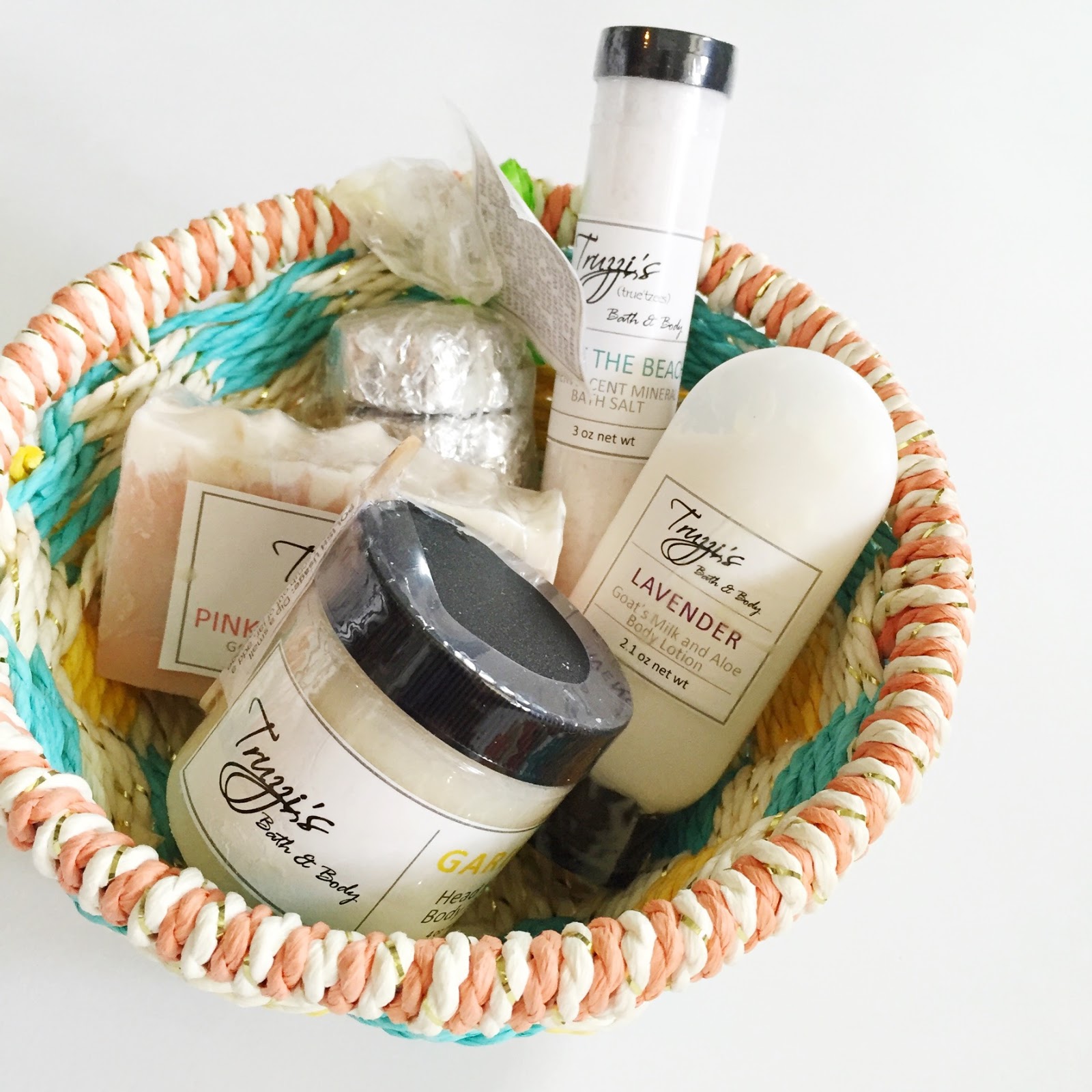 Whenever we have overnight company, I usually try to make an attempt to spoil them silly with some fun “welcome” products so that they feel at home. My friends at Truzzi’s reached out and we thought it would be fun to create a basket of goodies to show your guests a special touch so they can rest and relax with natural bath and body products made with goat’s milk. Not a regular B&B?? Use these as a housewarming gift, or as basket to pamper a special friend who needs a little bit of love [or yourself just because].