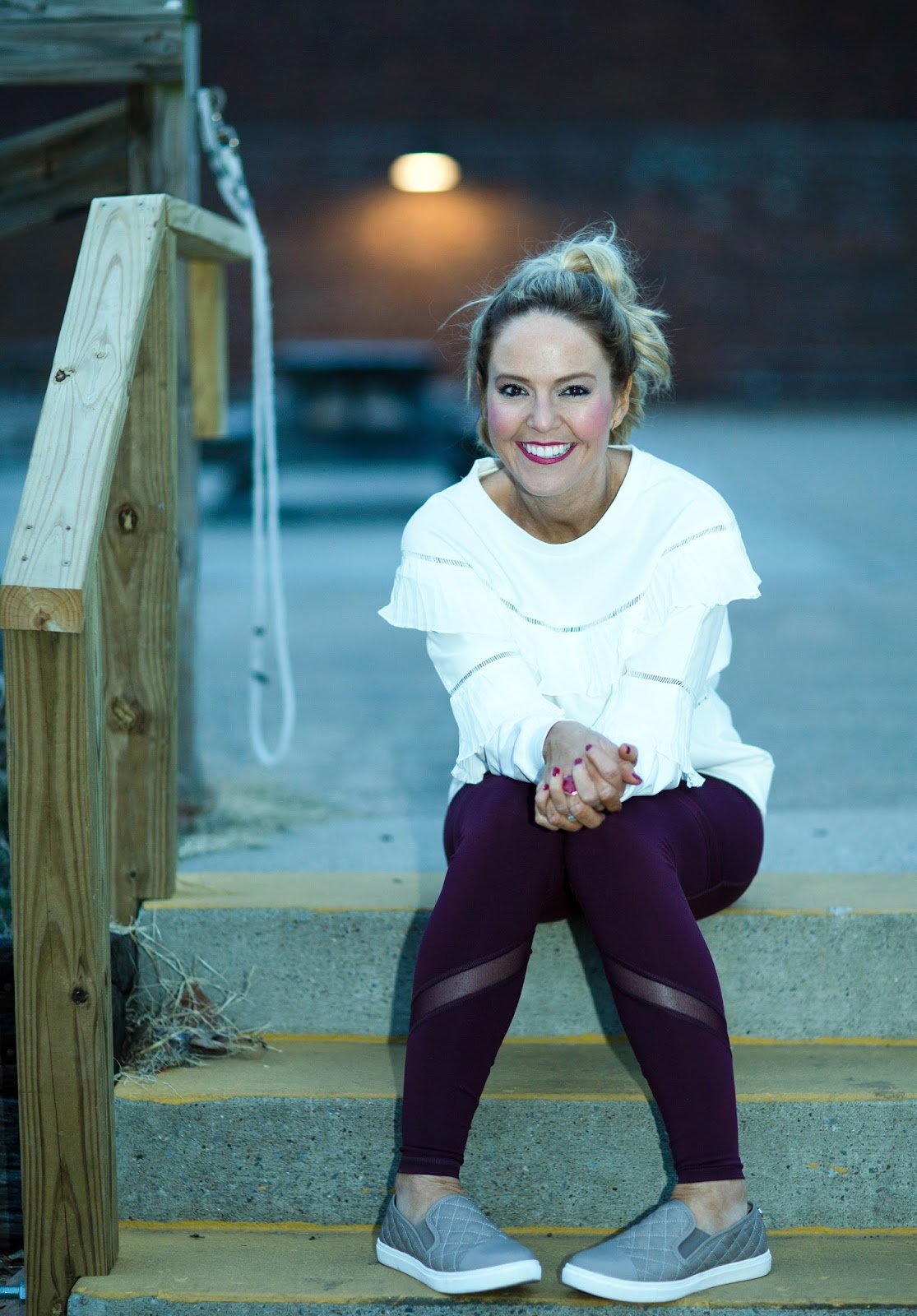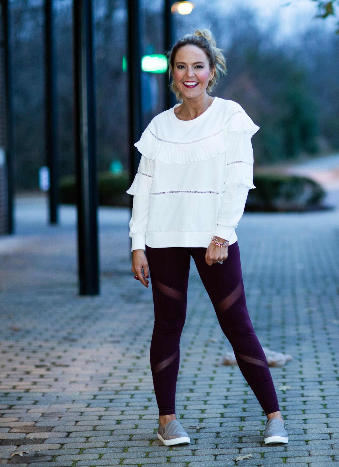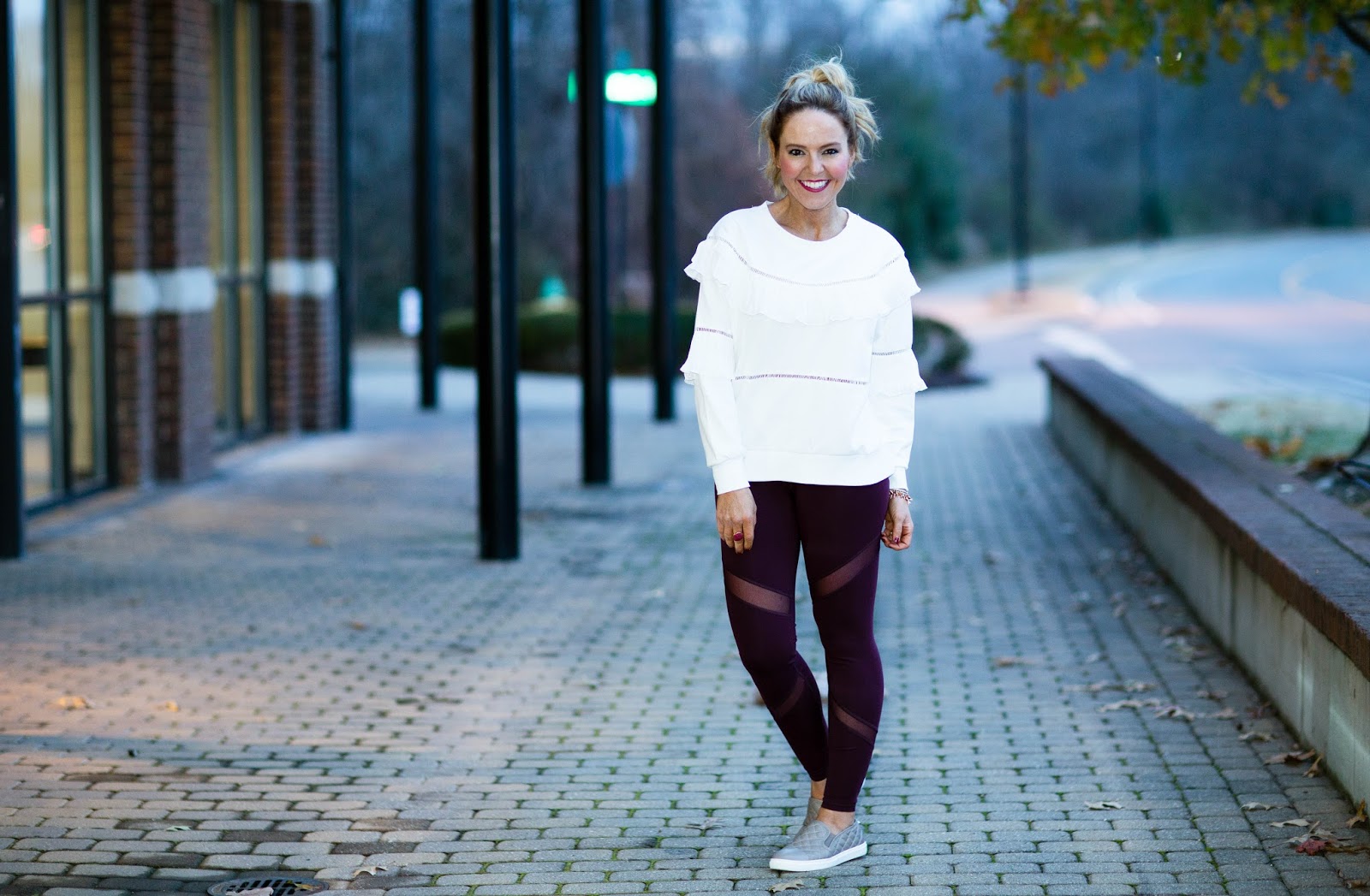 Just because my everyday style isn’t your typical nine-to-five look, that doesn’t mean I don’t want to dress well when I’m out and about… case in point, this easy, casual, athletic outfit: a White Eyelet Crochet Ruffle Trim Sweatshirt paired with Wine Compression Leggings.