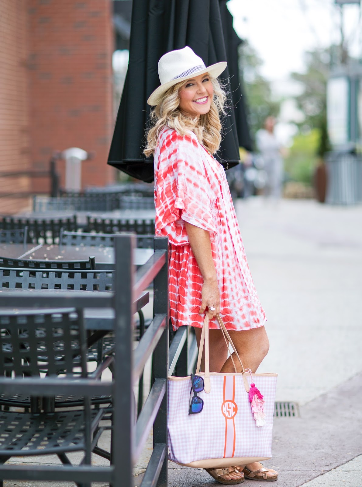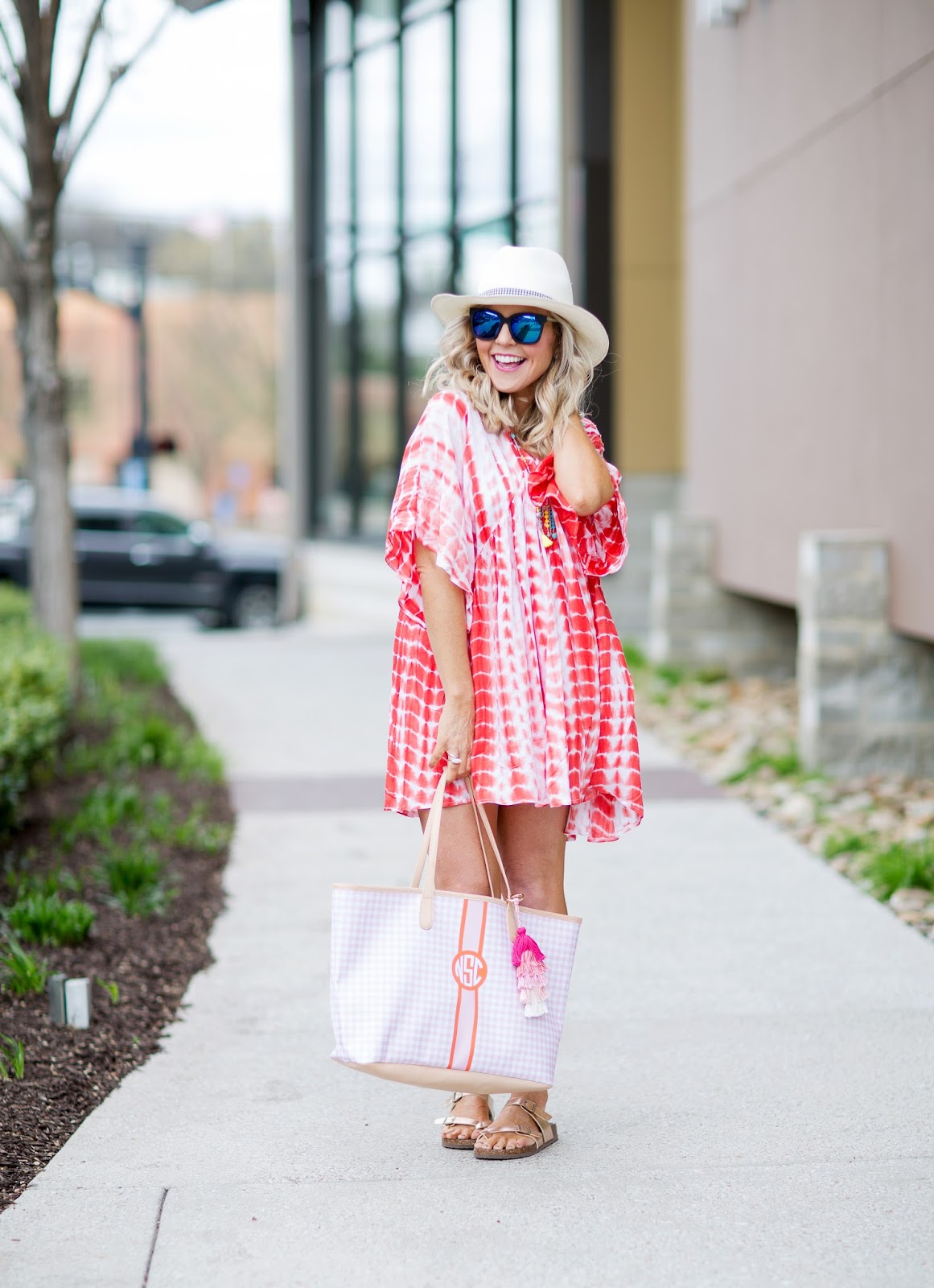 A perfect beachwear-ready ensemble, this Cool Coastal Orange Tie Die Cover-Up Dress is comfortable and a steal at just $38!! I paired it with these Rose Gold Flatbed Sandals [less than $40] and now I’m ready for some major fun in the sun with my babies. Of course, I added in some colorful flair including this White Straw Hat, Layered Necklace Ensemble, these polarized Matte Black and Blue Sunnies, and my Blush Pink and Orange Monogram Barrington Tote, too. P.S. this Ombre Pink Tassel Keychain is a MUST and just $14.