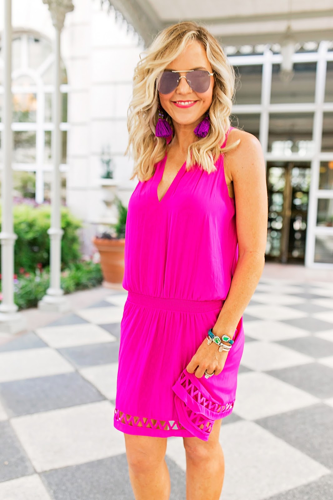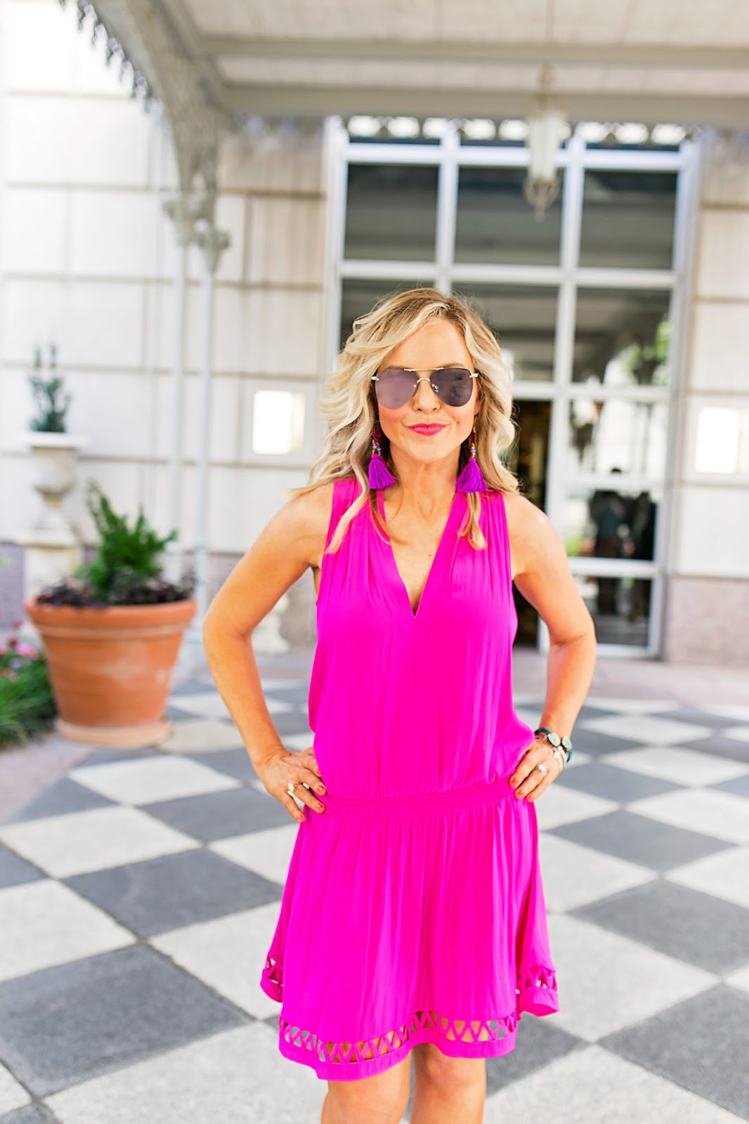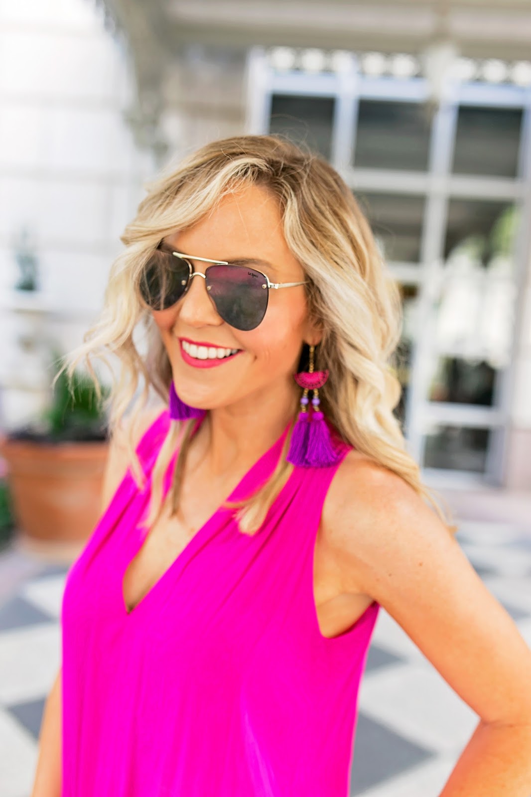 That bold pink looks AMAZING on you! And I love those earrings!