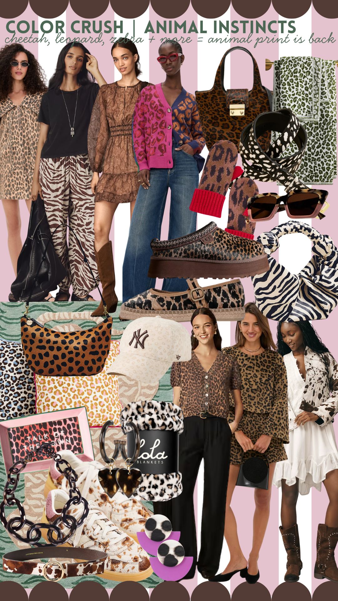 If you’re still wondering how to make animal print work for you, here’s your proof that it’s everywhere = from everyday sneakers and cozy blankets to statement dresses, handbags and even jewelry. This all out animal print inspo board is packed with all the cheetah, leopard, zebra and cow print goodness you could ever want, and it just goes to show how versatile these patterns really are in your wardrobe as well as your home!