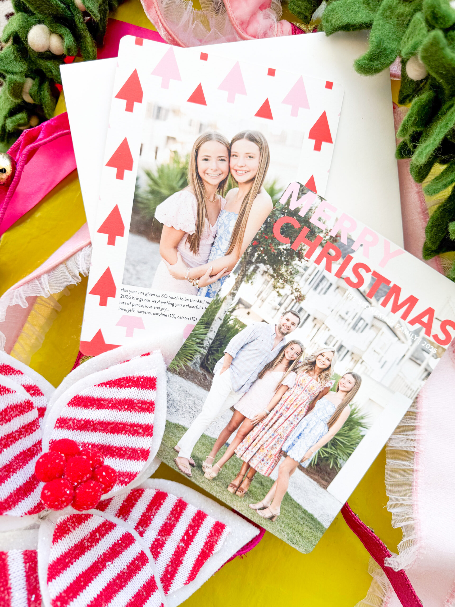 Checking out the latest designs, filtering by photos/design details/etc and knew instantly when I saw this Merry + Bold Card it was the one for us! With a colorful red + pink design in simple block letting, it was everything I dreamed of and more. I customized it to the grand size, added rounded corners for a little something different and then created a fun reverse pattern, photo of our girls and then wrote a simple sentiment for our friends and family for the coming year. I absolutely LOVE the finished product and cannot wait for those on our list to unwrap this in a few weeks!