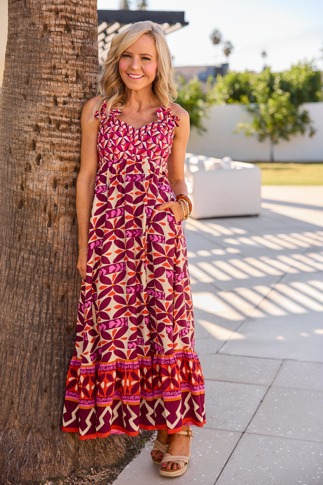 AVARA EXCLUSIVE. Farm Rio vibes for a fraction of the price… that was the initial thought when we put pen to paper for this lively + bright printed midi length must! I absolutely LOVE the finished design of this sunny destination dress = we integrated a fiery orange + red color palette with a punchy pop of fuchsia and the execution says effortlessly elevated. Of course we had to add on some fun bodice appliques for good measure, a back smocked bodice that makes it easy to throw on and adjustable straps, too. This is sure to be a standout style everyone will adore from this debut! [wearing XS, runs TTS]