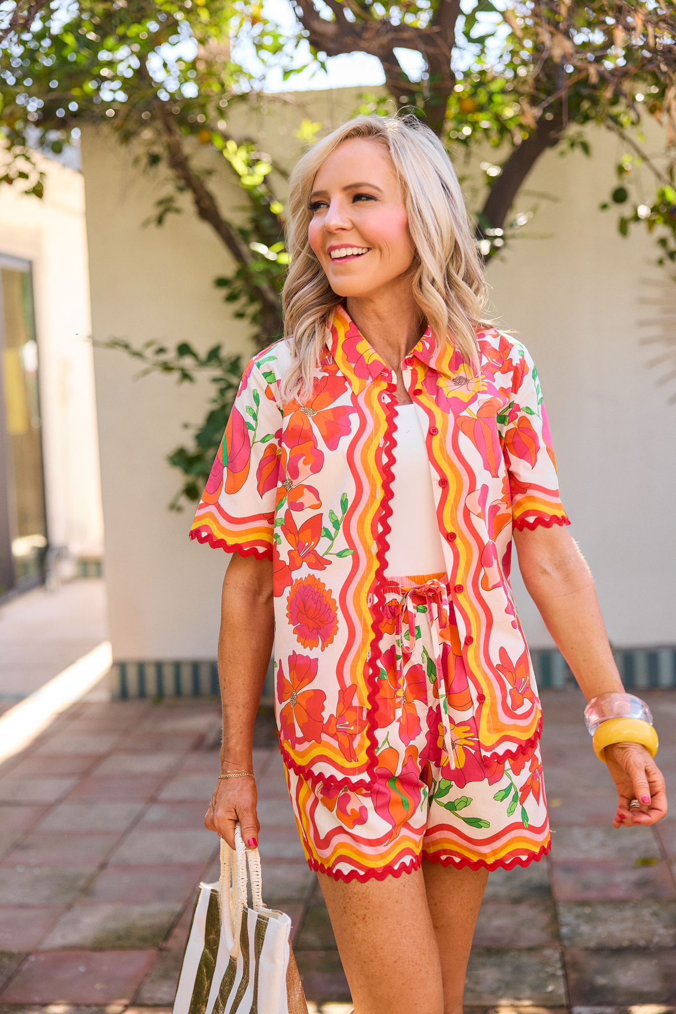 AVARA EXCLUSIVE. The perfect popover set… a total winner from lounging at the pool to a casual dinner with all your besties at the beach = say hello to this floral inspired favorite from my resort debut! A cheerful matching set that brings BIG tropical-vacation energy. The button-up top feels classic, but of course we added in ric rac trim for a playful element, while the shorts keep things comfy and laid-back. Wear them together for a fun statement or mix and match all season long. [wearing XS, runs TTS]