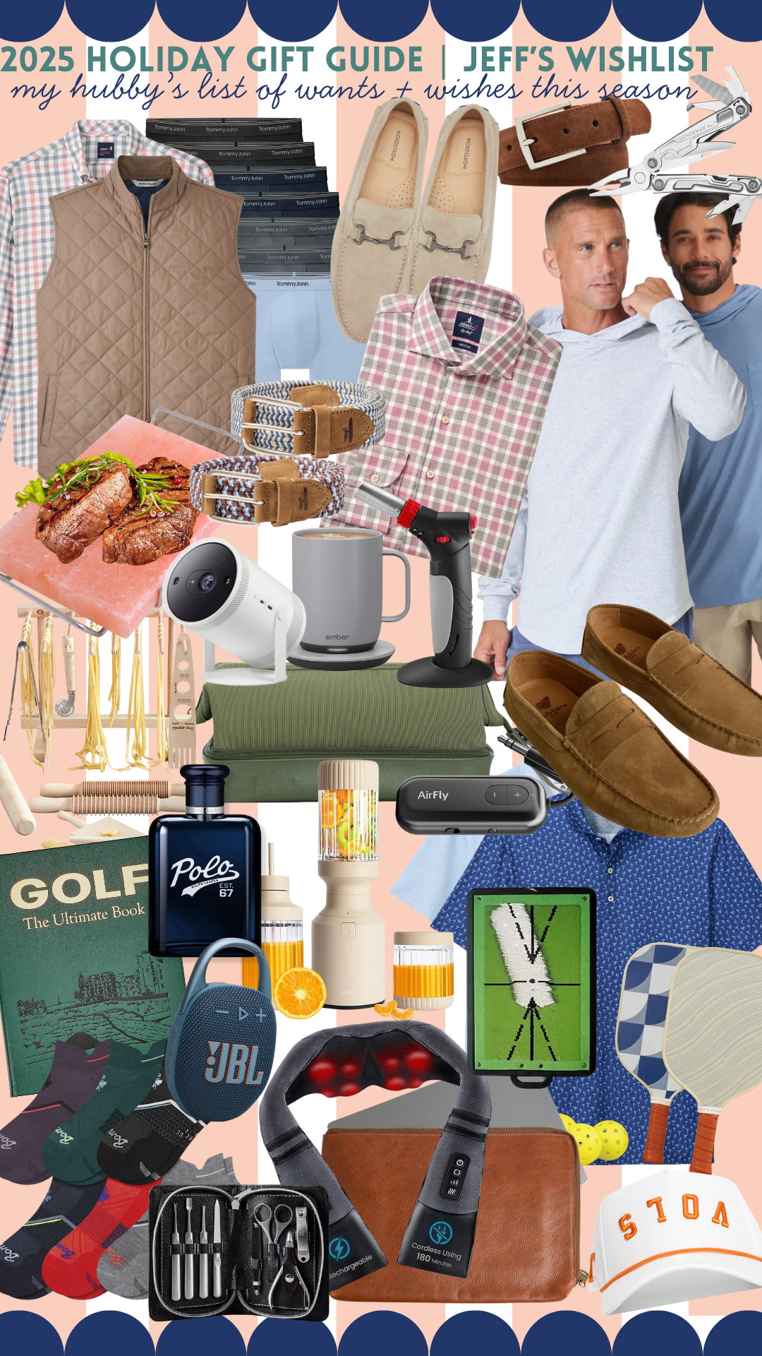 Now for the fun part… Jeff’s actual wishlist. He’s a creature of habit in the best way, so you’ll see the tried-and-true basics he swears by = Tommy John boxers, classic button-downs, everyday belts, and those loafers he rotates nonstop. But I also mixed in the “fun stuff” he keeps dropping hints about: the Ember mug for perfect-temperature coffee, a salt block for grilling, a little kitchen torch because boys love gadgets, and the Leatherman multitool that somehow solves every problem. Add in a travel organizer, a neck massager he’ll pretend he doesn’t need, new pickleball paddles, a portable blender, and his beloved golf book, and you’ve basically got Jeff in gift-guide form — practical, cozy and a little bit bougie…