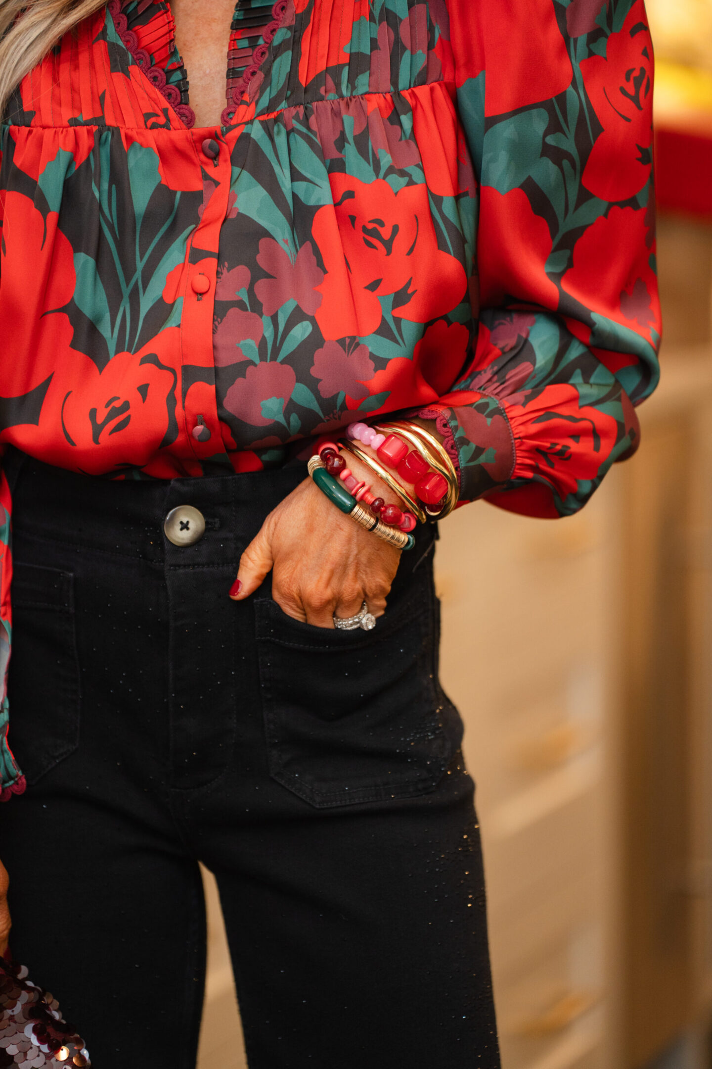 And then last but not least, let’s talk anything but traditional tops… I fell hard for this bold, beautiful floral otherwise known as The Oliver Top [wearing XS/runs TTS] = simply because it brings all the festive drama in the dreamiest way. The bold floral print, puff sleeves, and rich red-and-green palette make this top feel like a holiday statement without going literal and it’s a style that you can wear well through winter and into early spring. It’s polished, feminine, and so flattering, especially tucked into a high-rise black pant. Add a fun bag or bow-detailed heel and you’ve got an outfit that works for parties, date night, or any occasion where you want something elevated but still totally wearable. Need to see a few more favs?? The Heddy Top, Raelynn Top and Phoebe Blouse all top my charts when it comes to stylish shirts…