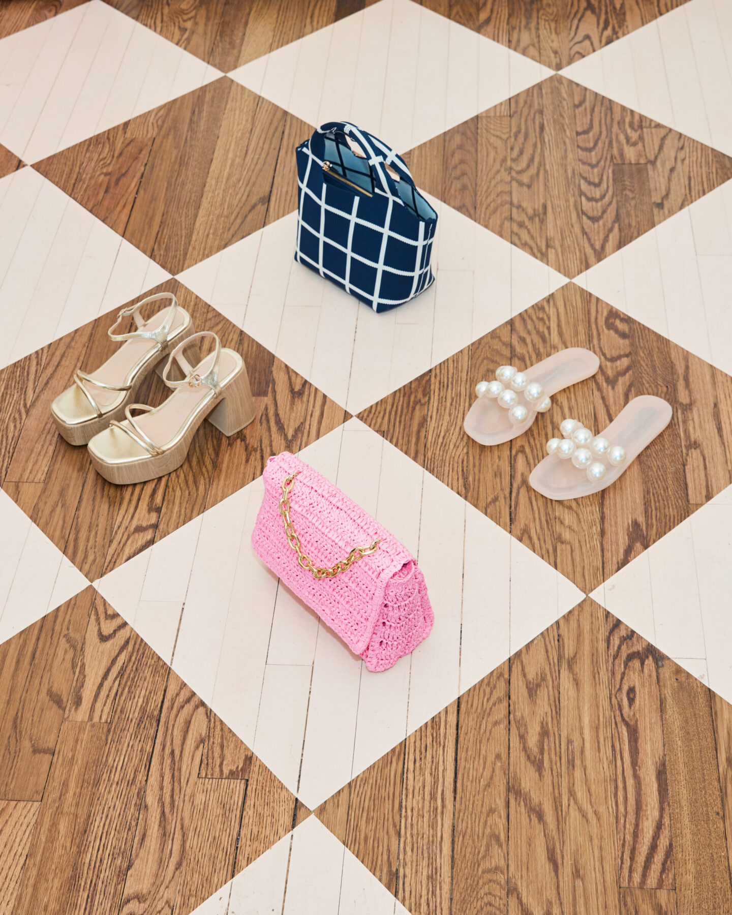 When it comes to belts, they finish off a styled look effortlessly so be sure to scoop up either the White or Pink Faux Leather Belt to cinch things up in style. As for bags, it’s hard to pick a favorite BUT the Robbie Navy Woven Bucket Bag is a winner when it comes to the design and coastal inspired colorway. P.S. another favorite would be the Beth Pink Raffia Crossbody Bag! Jewelry brings the charm with the Shayla Gold Square Stud Earrings + custom Sherry Pink Drop Earrings + Evelyn Pink Stone Ring and the fun hair duo that is the Gold Metal Barrette Set.