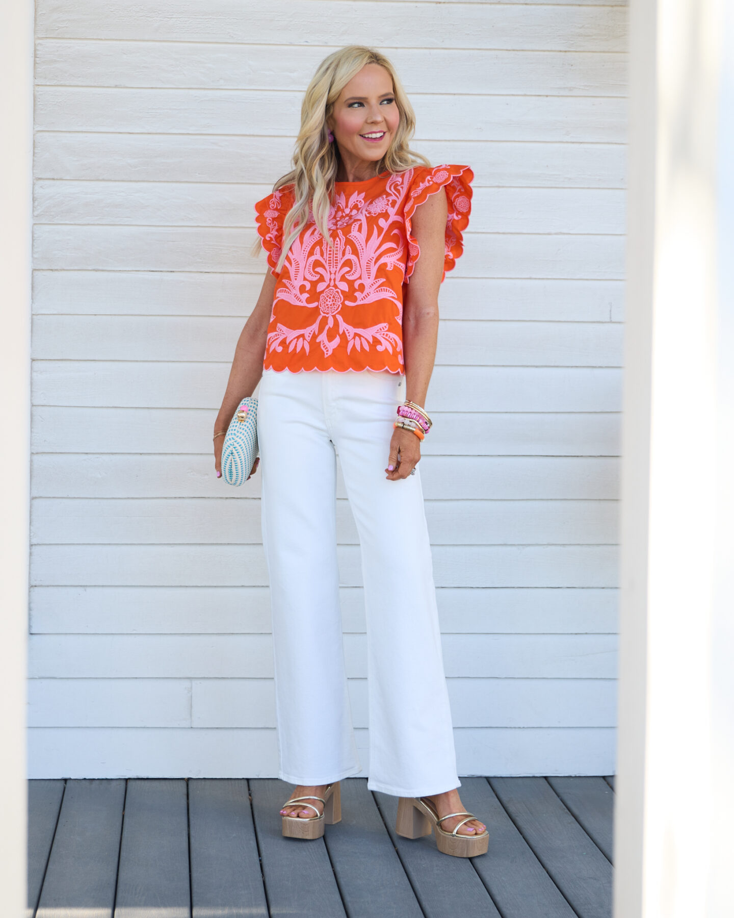 Exclusive Avara Design | Now you know good and well NO collection of mine would ever be complete without a proper pink and orange moment, am I right??? Back and better in an all new BOLD color palette, this best-selling silhouette from Avara has been reimagined in juicy orange and a pastel pepto pink combo that says spring escape! With feminine details designed to delight, this piece is even more special with its all over embroidery, scallop sleeves + bottom hem and a slightly cropped silhouette that pair perfectly with crisp white denim! [wearing XS/runs TTS]