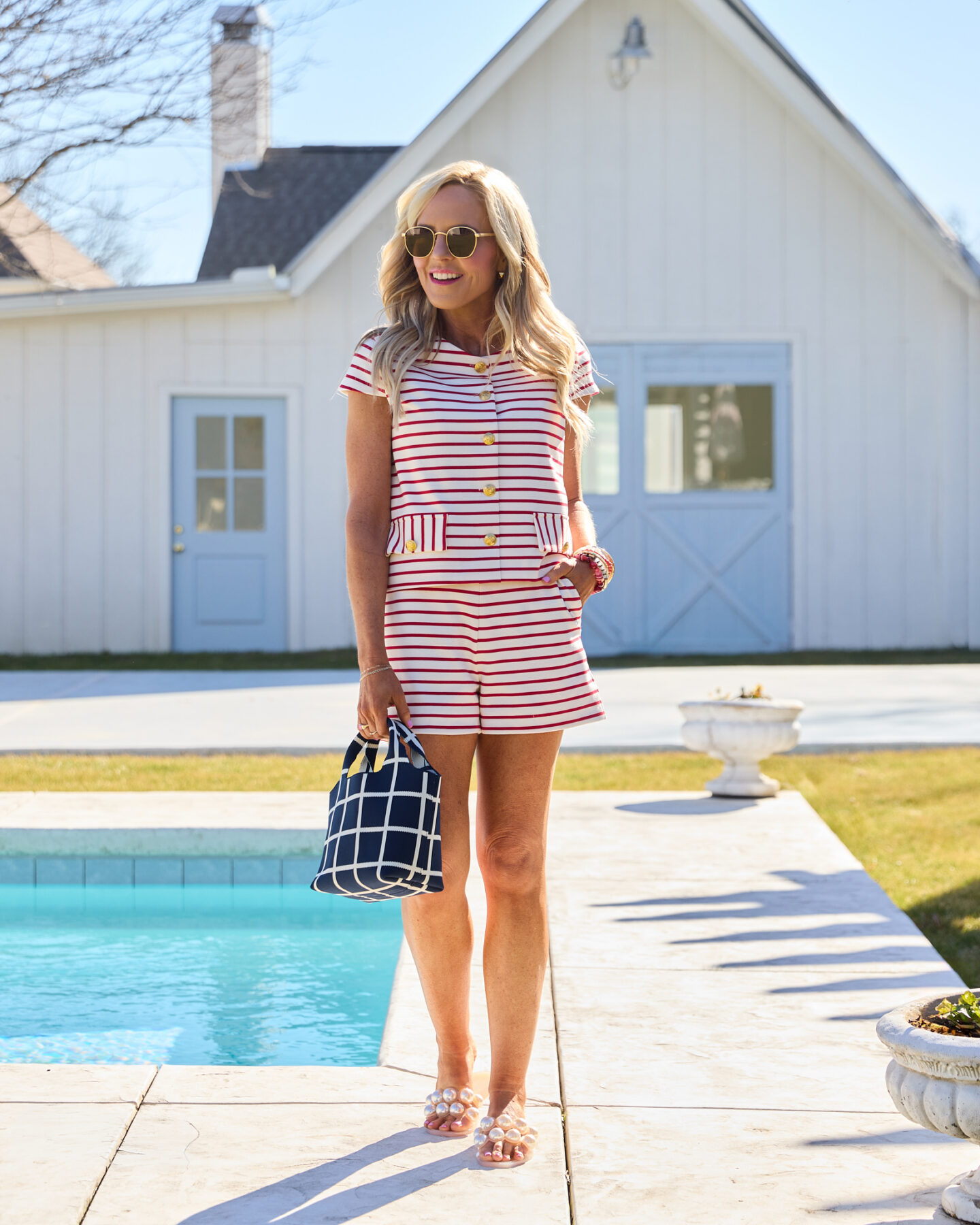 Exclusive Avara Design | Red + white = we designed these separates to be made for the getaway and loved long after. These striped pieces go everywhere beautifully. Structured and stylish in a classic color palette everyone wants to wear, they exude a timeless look—with modern details that keep them totally on trend. The cap-sleeve top gives this button-up a polished feel, complete with oversized gold buttons and, of course, I LOVE the vertical stripe pocket accents for good measure. Slip into the soft cotton shorts, and you’ve got a set that’s equally made for play and business casual moments alike. [wearing XS/runs TTS]