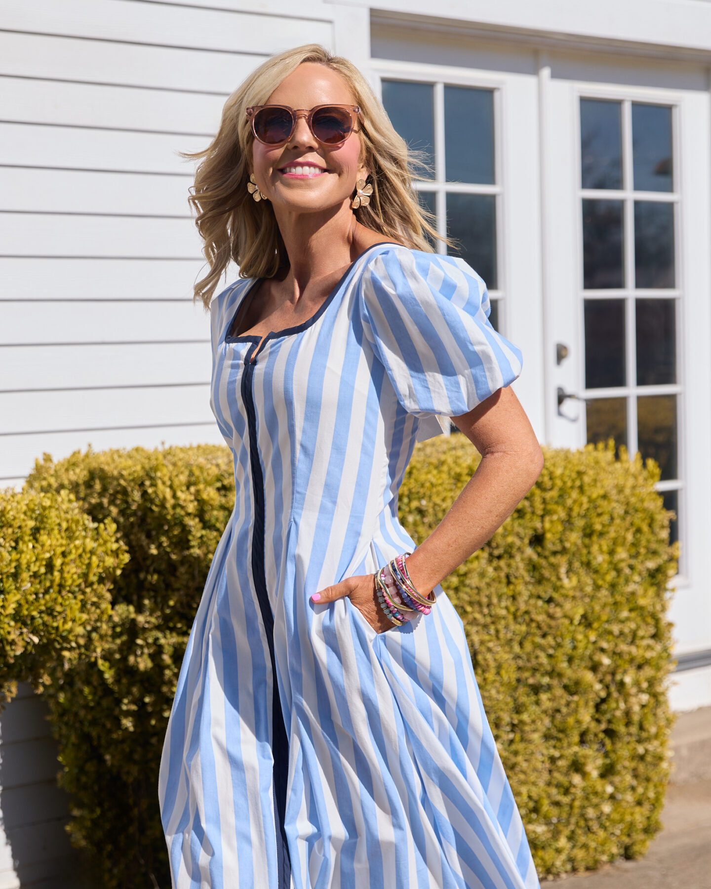 Shades of crisp + cool coastal blue = it’s time to head south with this vertical striped showstopper. We started with a simple color palette that screams spring and then incorporated navy blue accents throughout the bodice for a bit more contemporary look. Stripes… it’s what I am known for! The puff sleeves + effortless cut + spring hues make this one you’ll reach for over and over again this season AND into summer. [wearing XS/runs TTS]