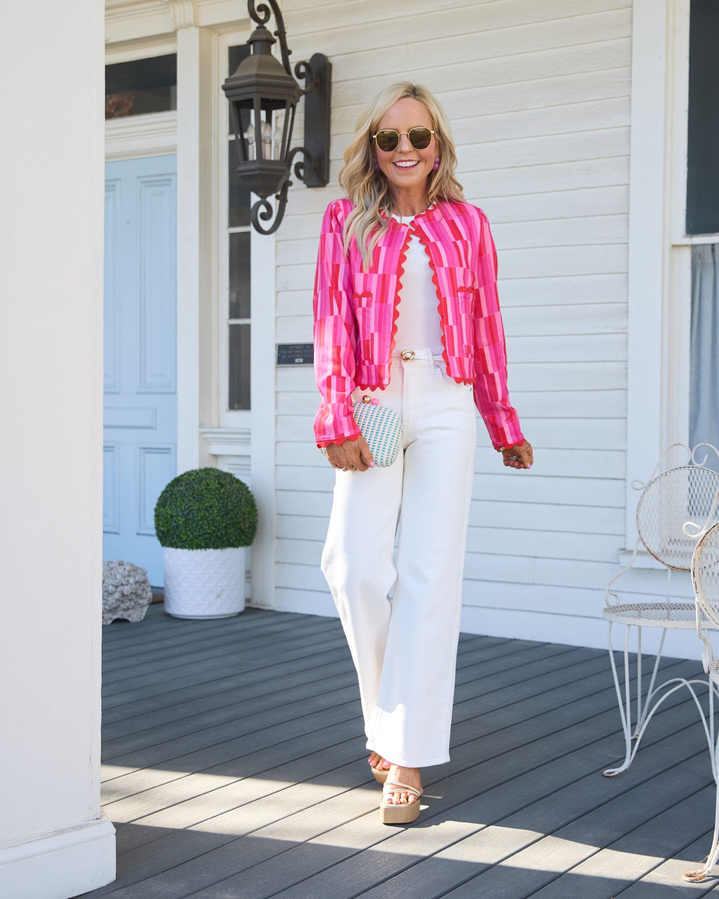 Exclusive Avara Design | Hot pink perfection coming right at you!! Every springtime ensemble needs a little layer when the temps drop and this special printed piece will WOW the crowds… the mini stripe print says “look at me now” and of course we added in fun accents to make it even more unique. Scallop edging adorns this cropped spring silhouette and the fit is truly fabulous… a statement all on its own and the perfect way to dress up an all white OOTD! [wearing XS/runs TTS]