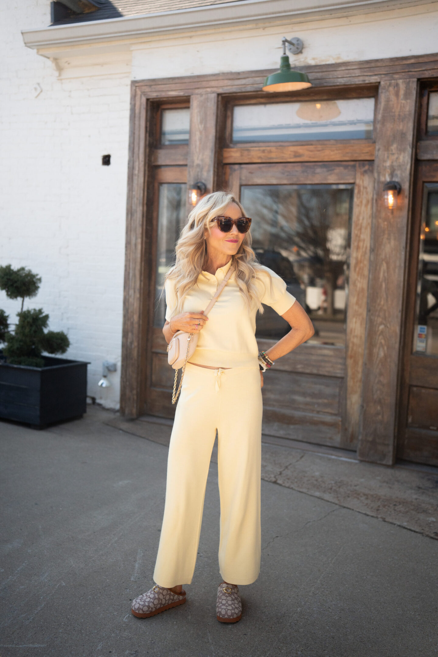 Oh look what just arrived at my address = total color drenching by way of this absolutely amazing, super soft sweater set from Splendid LA’s Spring Debut… I leaned all the way into this buttery goodness with the sweetest matching set that’s equal parts comfy and polished by way of the Christa Polo Sweater [wearing XS/runs TTS] + the coordinating Christa Cropped Knit Pant [wearing XS/runs TTS]. The soft knit top paired with the coordinating wide-leg pants gives that effortless, pulled-together feel while still being incredibly easy to wear for everyday errands, lunch dates, running around town OR an iconic travel set as well. I kept the accessories neutral with my go-to Neutral Bumbag and my Classic Coach Clogs for a little designer-inspired flair, then stacked on my Allie + Bess Athleisure Stack [NATASHA20 for 20% off] to add some personality. The result is an outfit that feels light, bright, and perfectly spring-ready—proof that sometimes a simple monochromatic moment is all you need to make a color truly shine.